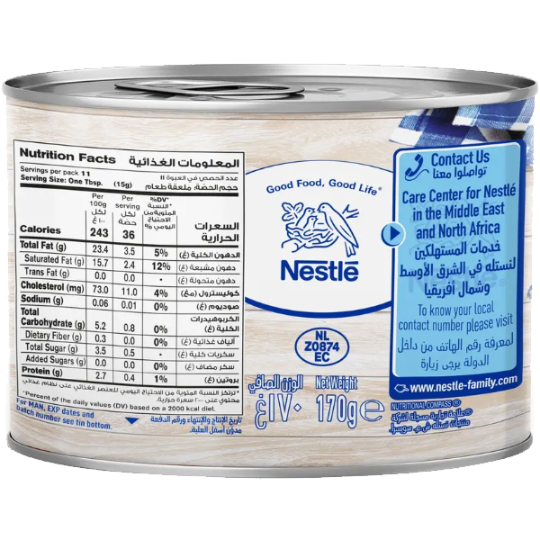 | Ingredients | Dairy Sterilized Cream (Milk fat 23%), Vegetable Thickeners (E401), Emulsifier (E471 from Soya). Contains milk and soya. |